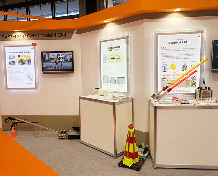 今回は『大型移動式防護車両』や『発炎筒投下装置』など、路上作業をより安全に行える新製品の展示もしております。