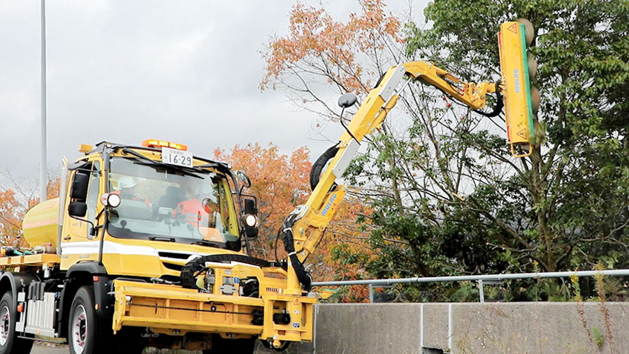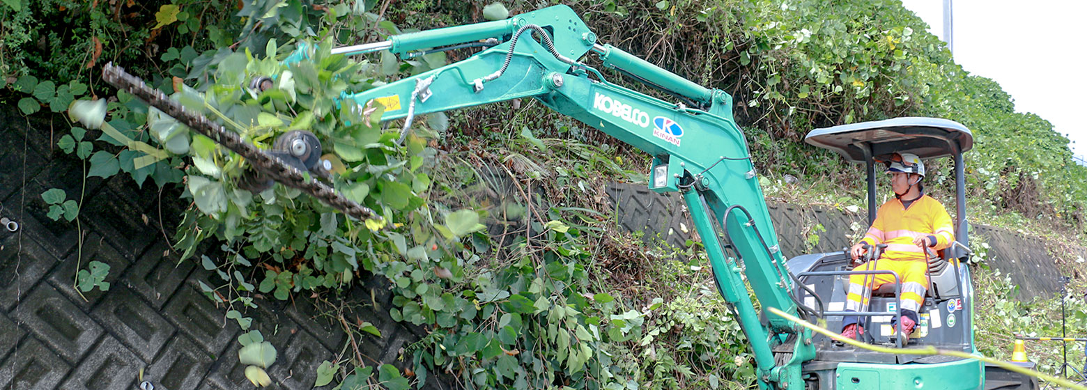 高速道路の本線部、のり面、休憩施設内の草刈りや樹木の剪定・伐採を定期的に行い、景観の向上と環境保全を通じて安心して走行できる高速道路の維持に努めています。さらに、ラジコン草刈機やバックホウ草刈り機の導入など、作業の機械化を進めることで、効率化と省力化を実現し、安全で快適な高速道路を支えています。