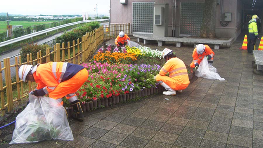 サービスエリアやパーキングエリアの植栽を整備し、景観美化と快適な空間づくりを行っています。剪定や除草を通じて、お客さまに心地よい休憩環境を提供します