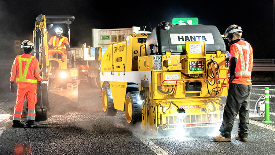 路面切削機の導入により、小規模な交通規制下で迅速な作業が可能となりました。また、加熱・溶解や養生を必要としない床版防水材を開発・導入し、施工性と安全性の向上に取り組んでいます。 -